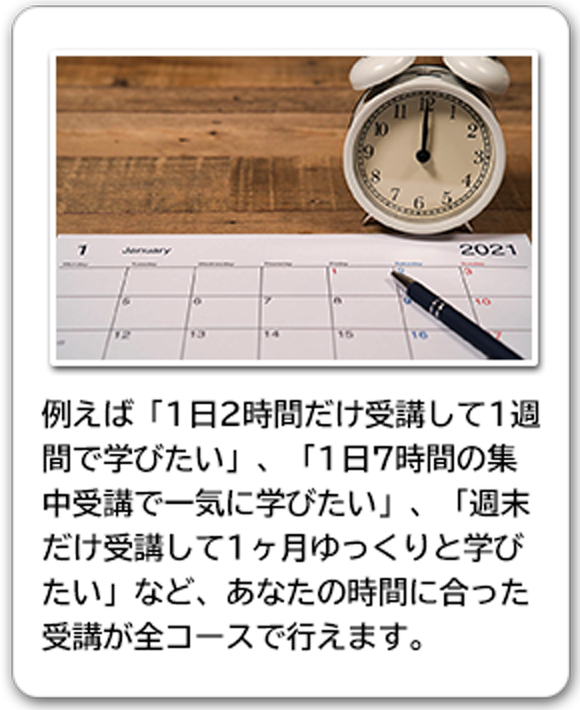 受講者の目的やライフスタイルに合わせて、授業時間を選択することが出来ます。