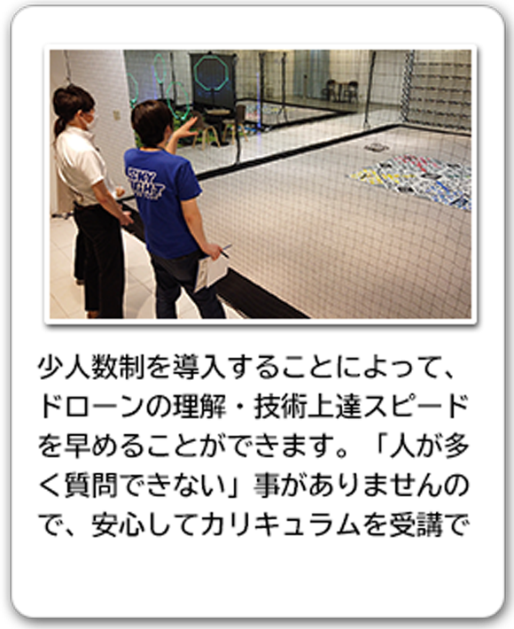 当スクールでは少人数制(マンツーマン指導がほとんど)を重視。ドローンを安全に飛行させる操縦技術や、空撮や点検など、ドローンのビジネス活用に必要な操縦技術・法令知識を短時間で身につけることができます。