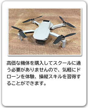 カリキュラムで使用する備品は全て無料貸し出し。気軽にドローン操縦を学べます。