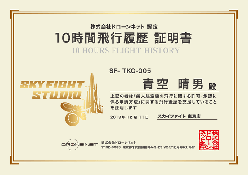 包括飛行許可の承認を得るための実績証明書です。初級・中級の講座を最後まで受講した方は飛行履歴として証明書をお渡しします。
